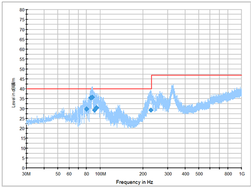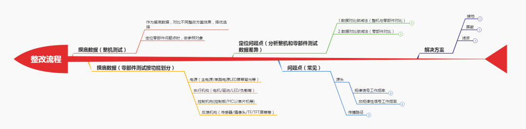 TIPS:整改過程中,可以借助磁環(huán)/頻譜儀(近場掃描)/暗室等工具進行模塊化分析.在確定問題過程中應(yīng)該關(guān)注數(shù)據(jù)的整體變化趨勢,而不是只關(guān)注某個頻點的數(shù)值變化.通過對比前后狀態(tài)數(shù)據(jù)綜合定位問題。