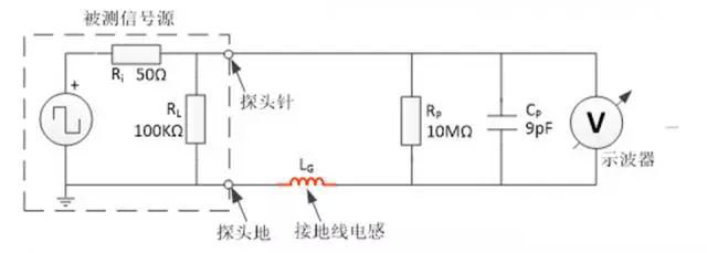 由于地線是一根導(dǎo)線,因此它有一定數(shù)量的分布式電感,線越長電感則越大。常規(guī)的測量方法就會由鱷魚線引入分布式感,此時(shí)它的等效模型如圖4所示的LG電感,這一電感將與探頭電容相互影響,在LG和CP值確定的某個(gè)頻點(diǎn)上形成諧振,導(dǎo)致減幅振蕩現(xiàn)象的產(chǎn)生。