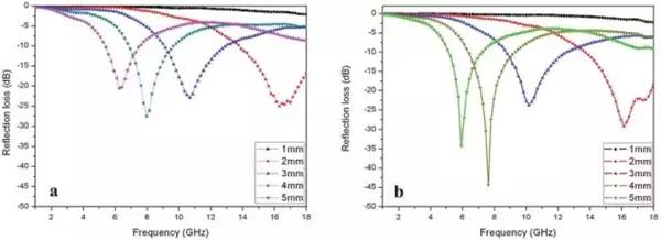 圖6、NiFe2O4納米顆粒-石墨烯復(fù)合材料(a)和NiFe2O4納米棒-石墨烯復(fù)合材料(b)的吸波性能