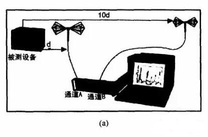 在被測設備(EUT)的前方一定距離(d)處放置一天線并連接到通道A,負責接收來自EUT以及背景共同作用的信號。另外一個天線則放置在離EUT較遠的地方,其距離至少是d的十倍,并連接到通道B,負責測量來自整個背景的噪聲情況。