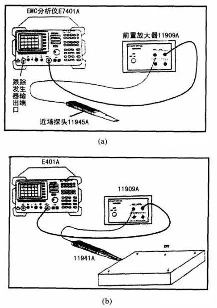 采用安捷倫84105EM電磁兼容診斷系統(tǒng),該系統(tǒng)由EMC分析儀E7401A(含選件跟蹤發(fā)生器前置放大器11909A)和近場探頭套(含11941A和11940A近場探頭)組成,參見圖5(a)。